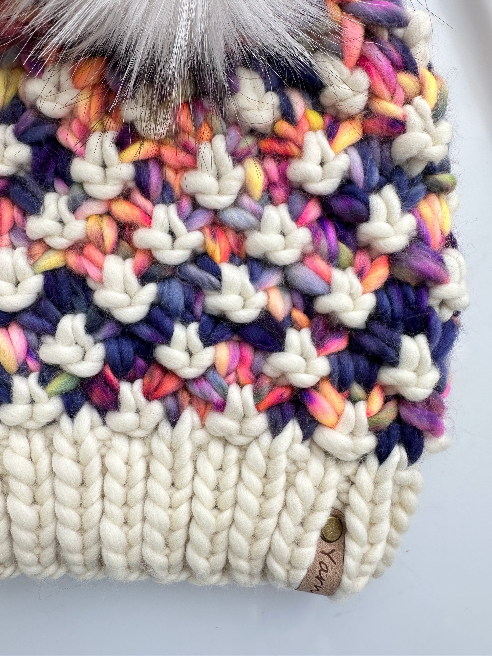 This knitted hat Is made up of stunning blue pink and orange neon rainbow tones! The colors are accentuated by its gorgeous textured design along with a complimentary neutral color. This hat is made of Nellas Cottage Fibers and Malabrigo Rasta 100% Merino wool. Known for its softness and warmth, It is a breathable, odor resistant wool that absorbs moisture keeping you warm and dry in those winter months! Merino Wool is naturally long, which makes for a strong fiber. Because of the high quality of this wool, this hat will wear well, maintain its shape, and remain looking great! It is topped with a white colored faux fur pom that is secured to the hat with a toggle for easy removal. The pictures of this hat are taken in natural light and are not altered. Color is depicted in pictures to the best of my ability. It may vary slightly in person from your computer screen.
