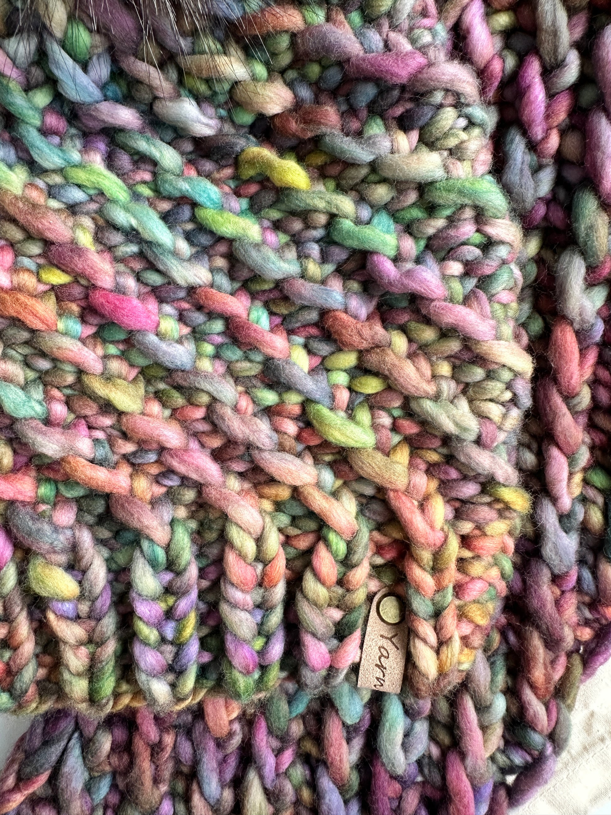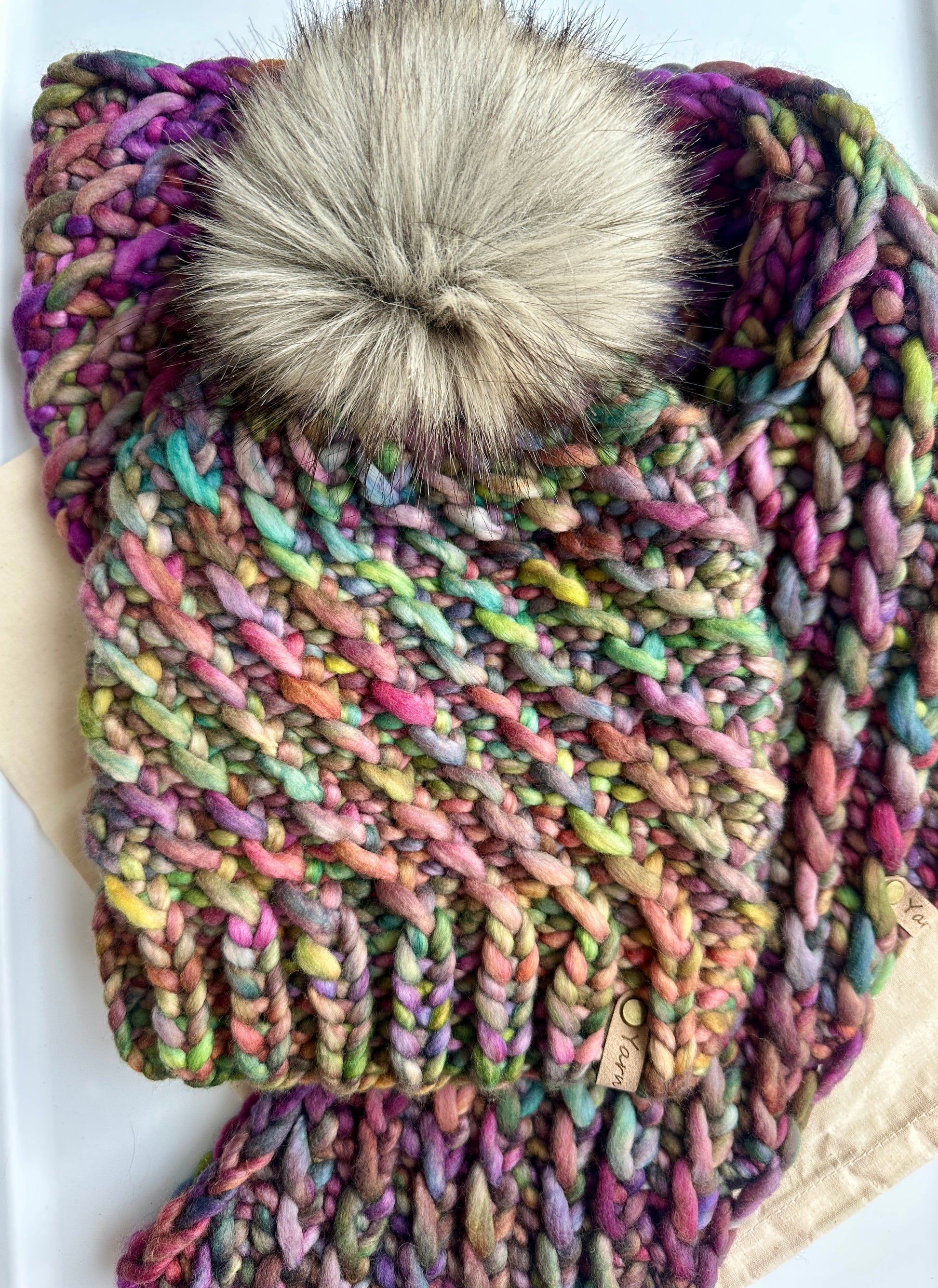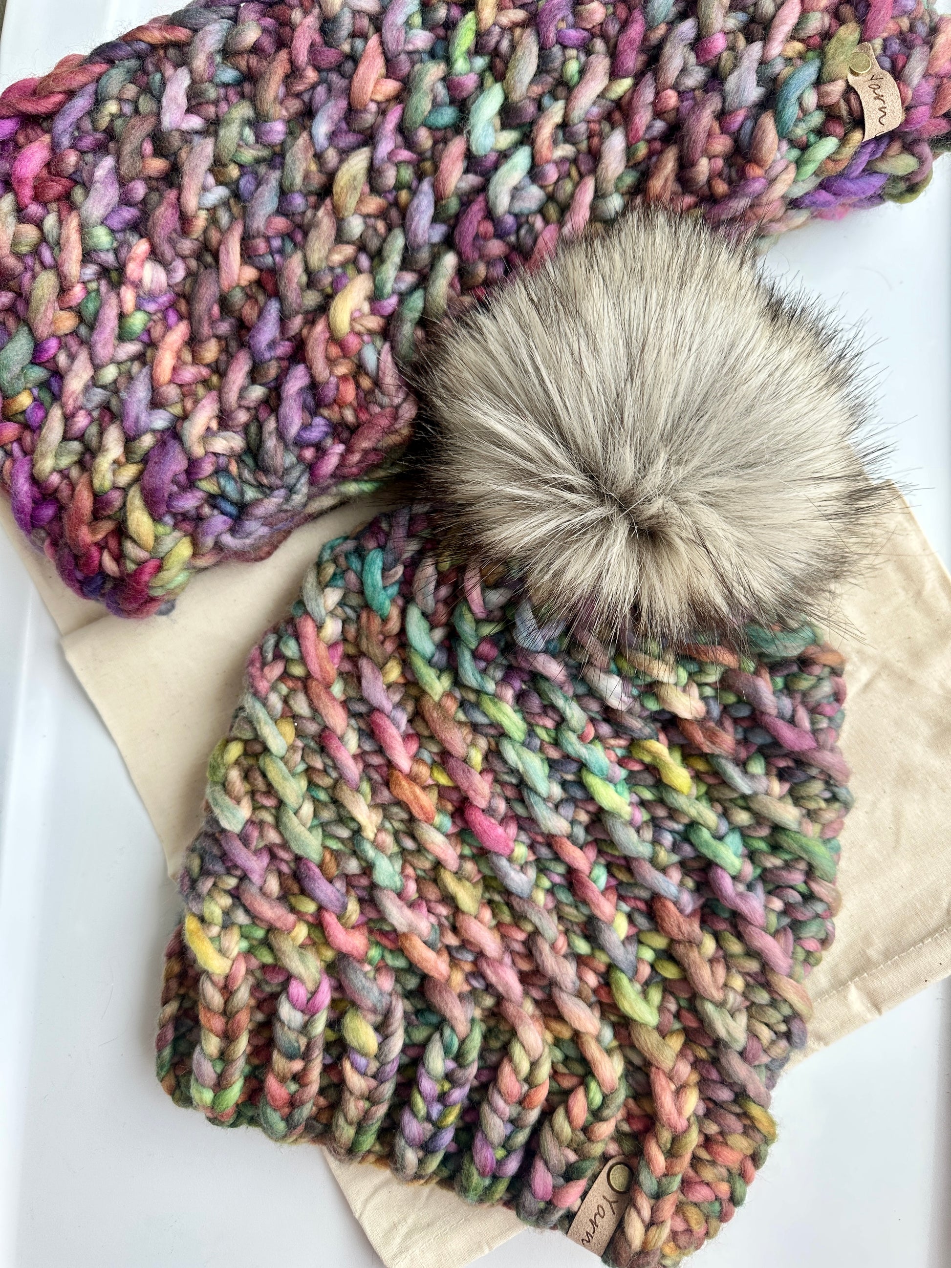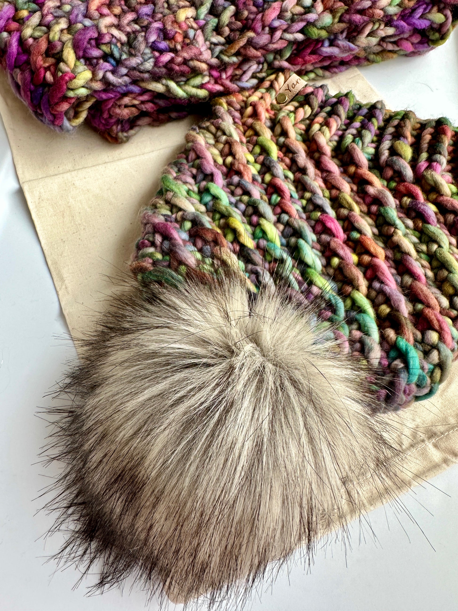 Reserved for Kristina This knitted hat Is made up of a beautiful rainbowtones that are accentuated by its gorgeous textured design. This hat is made of Malabrigo Rasta 100% Merino wool. Known for its softness and warmth, It is a breathable, odor resistant wool that absorbs moisture keeping you warm and dry in those winter months! Merino Wool is naturally long, which makes for a strong fiber. Because of the high quality of this wool, this hat will wear well, maintain its shape, and remain looking great! It is topped with a gray colored faux fur pom that is secured to the hat with a toggle for easy removal. The pictures of this hat are taken in natural light and are not altered. Color is depicted in pictures to the best of my ability. It may vary slightly in person from your computer screen.